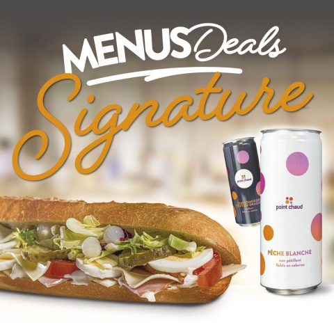 - Menu Signature : Avec le Menu Signature, à l'achat d'un grand sandwich ou d'un wrap au choix, ajoutez une boisson point chaud pour seulement 1,50€ de plus. Pêche blanche ou pamplemousse fruits du dragon, à vous de choisir ! Simple, complet et efficace pour votre pause lunch !