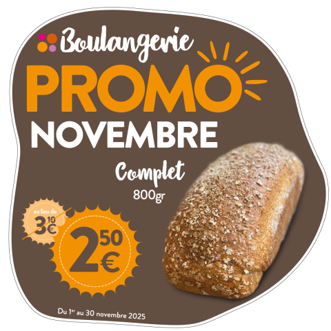 Pour ce mois de novembre, nous vous proposons notre pain complet 800gr au prix de 2,50€ au lieu de 3,10€ !